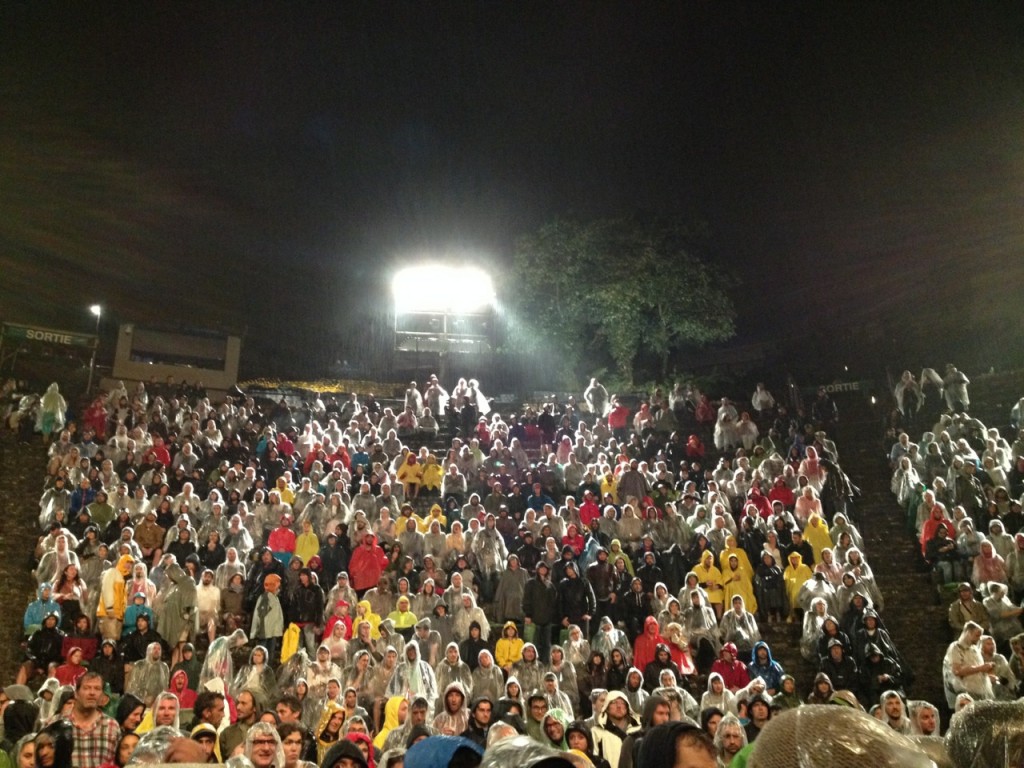 Arrivée au Théâtre Antique de Fourvière, 20h. Putain, il ne pleut plus. Nickel. Pile le temps d’aller choper une bière, de la boire, de l’évacuer, et en route pour les gradins. Ah, il pleut. Dans le doute, on va acheter des ponchos à usage unique (1€, c’est pas la mer à boire). Assis sur les désormais célèbres coussins de Fourvière -dont le briefing pré-concert nous apprendra qu’ils ne pourront être jetés, contrairement à la coutume -immobiles (et déjà moites) que nous voyons les Canadiens de Timber Timbre arriver sur scène, après une prise de parole des Intermittents. Prise de parole laissée par le festival, qui ne cherche pas à masquer son soutien à ces personnes de l’ombre sans qui rien n’est possible, ce qui est tout à leur honneur.